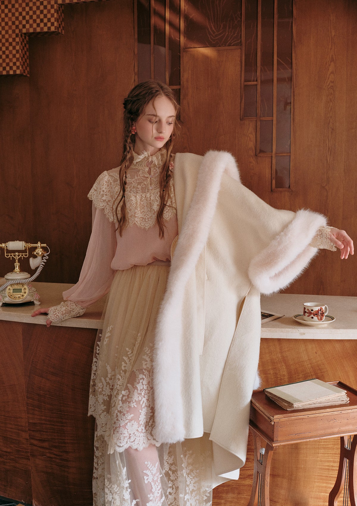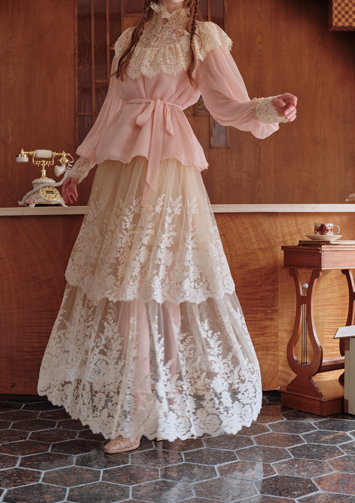- The retro lace high collar design modifies the elegant shoulders and neck lines.